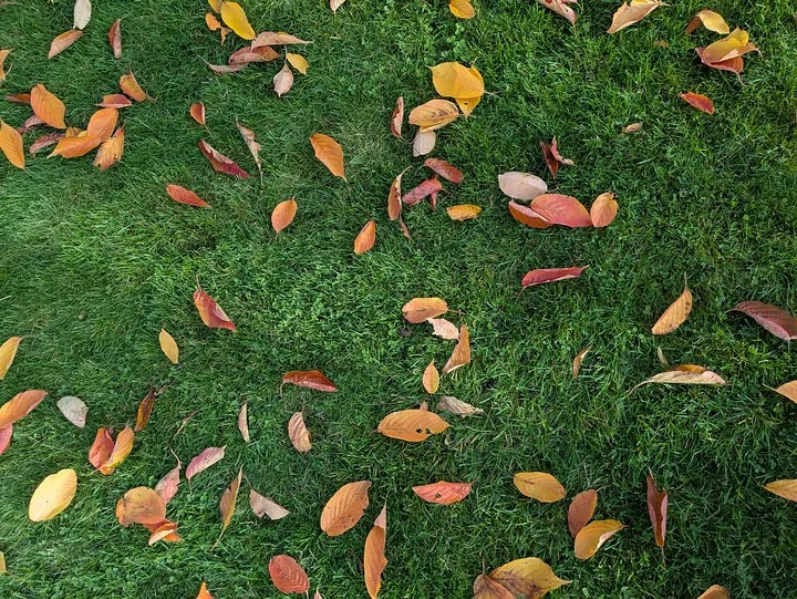 The lawn is green again, now that the summer heat is gone and the fall rains have begun again in earnest. Bright yellow pin oak leaves and rich crimson maple leaves dot the emerald lawn like candy sprinkles. The beauty is almost too much to take in at once.